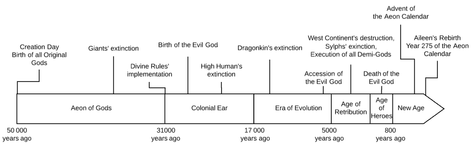 Some of you wanted to know more about the world's history, so here is a historical timeline of the major events. It's not exactly a spoiler, as those are events that happened prior to the beginning of the story, but most of them have yet to be mentioned, so I'll still add a spoiler tag.