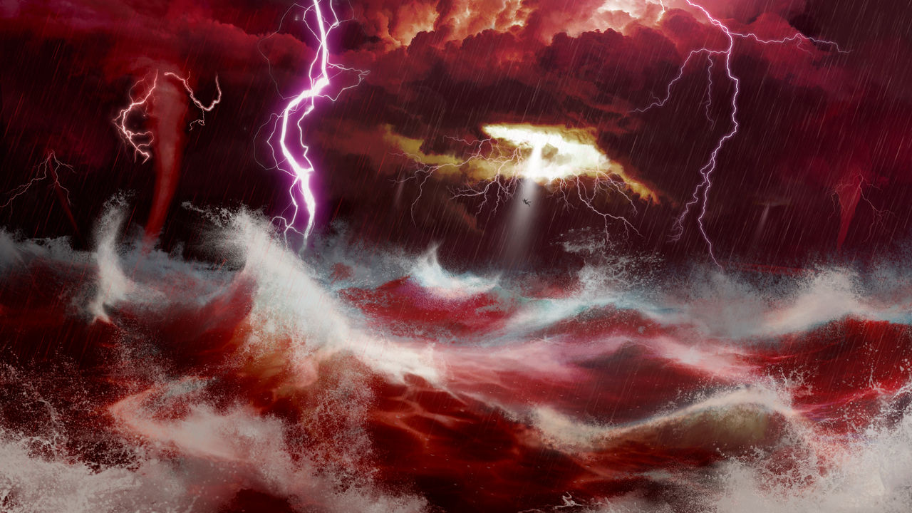 Massive beams of energy broke past the colossal waves, shooting into the heavens. The violet sky was turning rosen as the rays of light forced the clouds to circle them like a hurricane, and hot air whipped past Scarlet’s face as jets of wind pulled the water into raging cyclones.