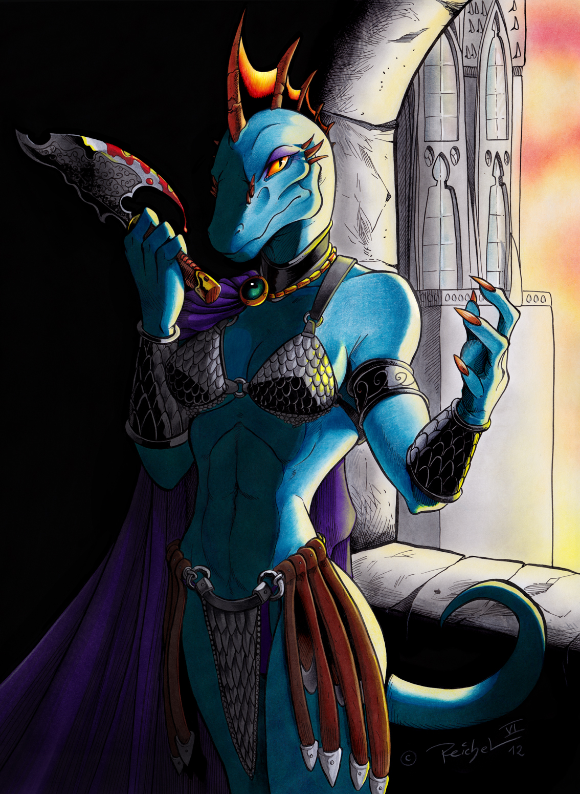 Teeth gritted in a snarl at the thought, she tried to roll to her feet, when a slim hipped lizard that looked much like a human, strode into the cave. With light green scales, red striped paint on her cheeks, and golden eyes, she immediately knelt down by Daria’s side, her expression worried. “You must not move, your wounds will reopen again.”