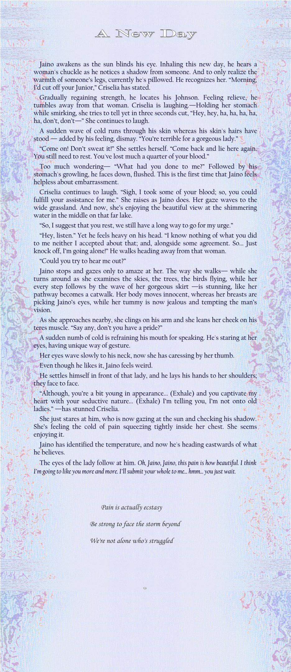 Jaino awakens as the sun blinds his eye. Inhaling this new day, he hears a woman's chuckle as he notices a shadow from someone. And to only realize the warmth of someone’s legs, currently he's pillowed. He recognizes her. “Morning, I’d cut off your Junior,” Criselia has stated.