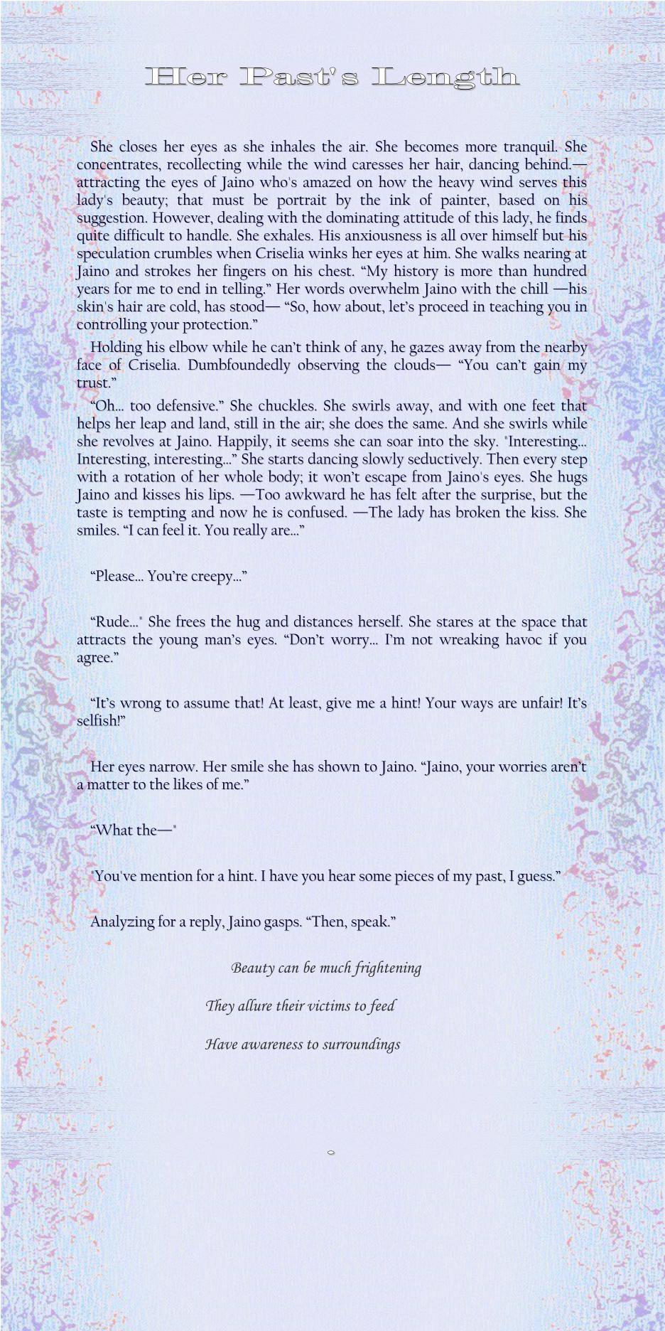 She closes her eyes as she inhales the air. She becomes more tranquil. She concentrates, recollecting while the wind caresses her hair, dancing behind.—attracting the eyes of Jaino who's amazed on how the heavy wind serves this lady's beauty; that must be portrait by the ink of painter, based on his suggestion. However, dealing with the dominating attitude of this lady, he finds quite difficult to handle. She exhales. His anxiousness is all over himself but his speculation crumbles when Criselia winks her eyes at him. She walks nearing at Jaino and strokes her fingers on his chest. “My history is more than hundred years for me to end in telling.” Her words overwhelm Jaino with the chill —his skin's hair are cold, has stood— “So, how about, let’s proceed in teaching you in controlling your protection.”