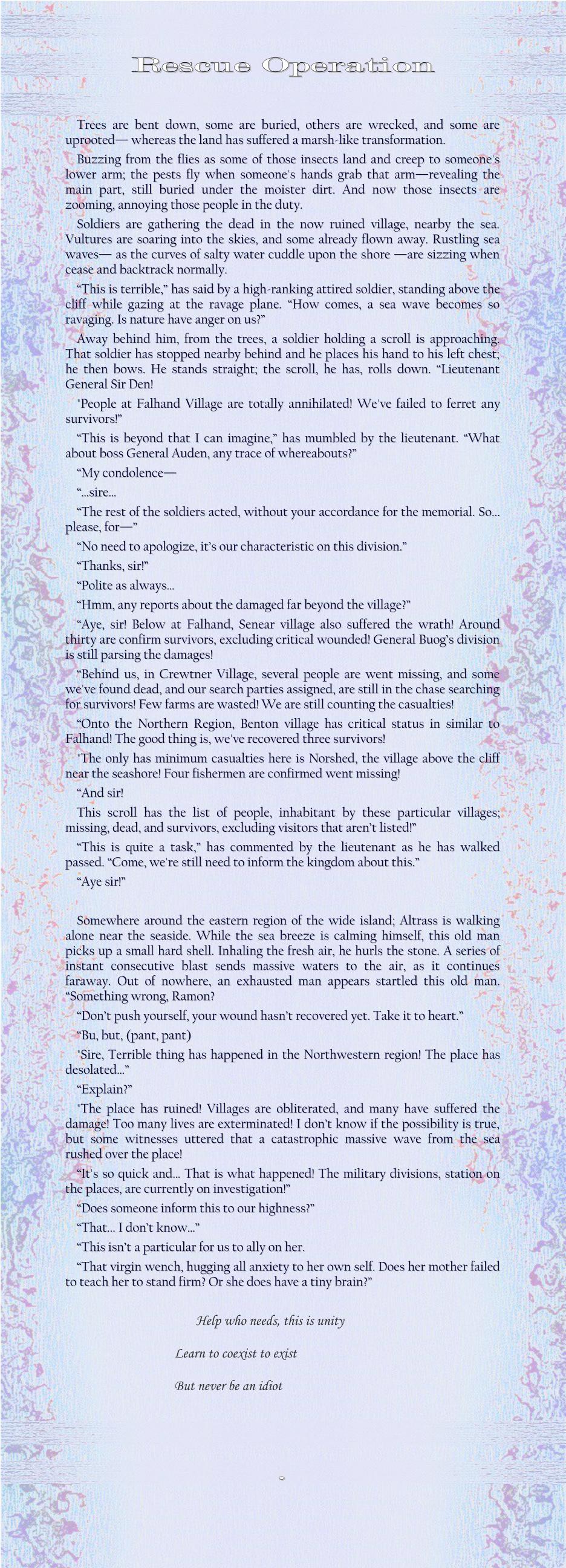 Somewhere around the eastern region of the wide island; Altrass is walking alone near the seaside. While the sea breeze is calming himself, this old man picks up a small hard shell. Inhaling the fresh air, he hurls the stone. A series of instant consecutive blast sends massive waters to the air, as it continues faraway. Out of nowhere, an exhausted man appears startled this old man. “Something wrong, Ramon?