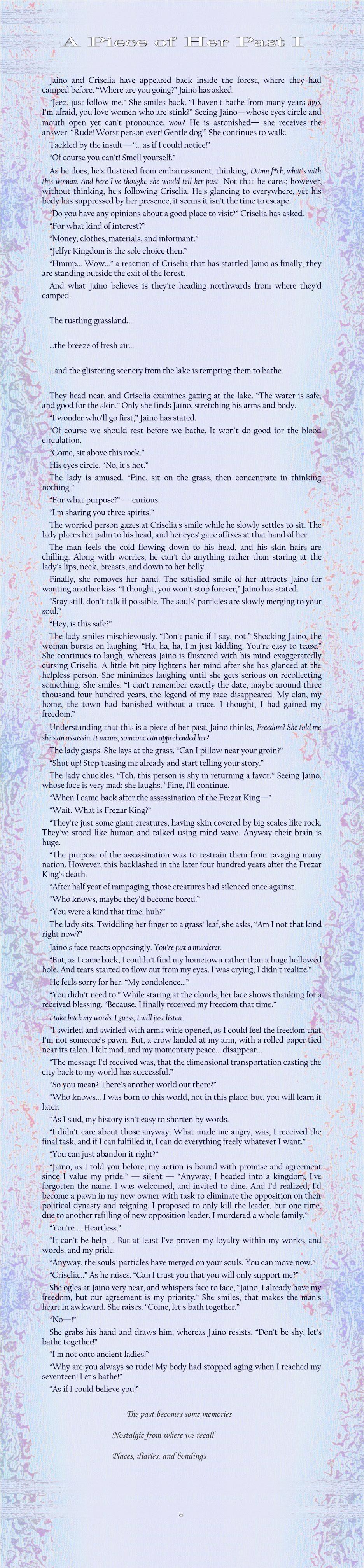 “Jaino, as I told you before, my action is bound with promise and agreement since I value my pride.” — silent — “Anyway, I headed into a kingdom, I've forgotten the name. I was welcomed, and invited to dine. And I'd realized, I'd become a pawn in my new owner with task to eliminate the opposition on their political dynasty and reigning. I proposed to only kill the leader, but one time, due to another refilling of new opposition leader, I murdered a whole family.”