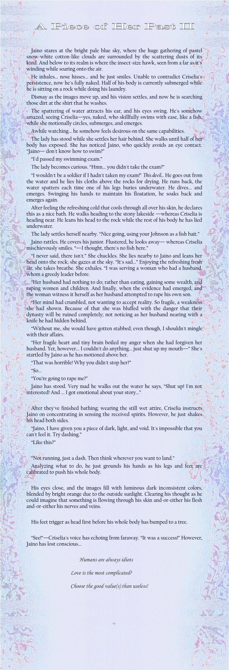 After feeling the refreshing cold that cools through all over his skin, he declares this as a nice bath. He walks heading to the stony lakeside —whereas Criselia is heading near. He leans his head to the rock while the rest of his body he has lied underwater.