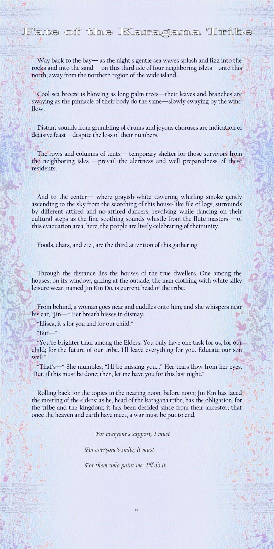 Rolling back for the topics in the nearing noon, before noon; Jin Kin has faced the meeting of the elders; as he, head of the karagana tribe, has the obligation, for the tribe and the kingdom; it has been decided since from their ancestor; that once the heaven and earth have meet, a war must be put to end.