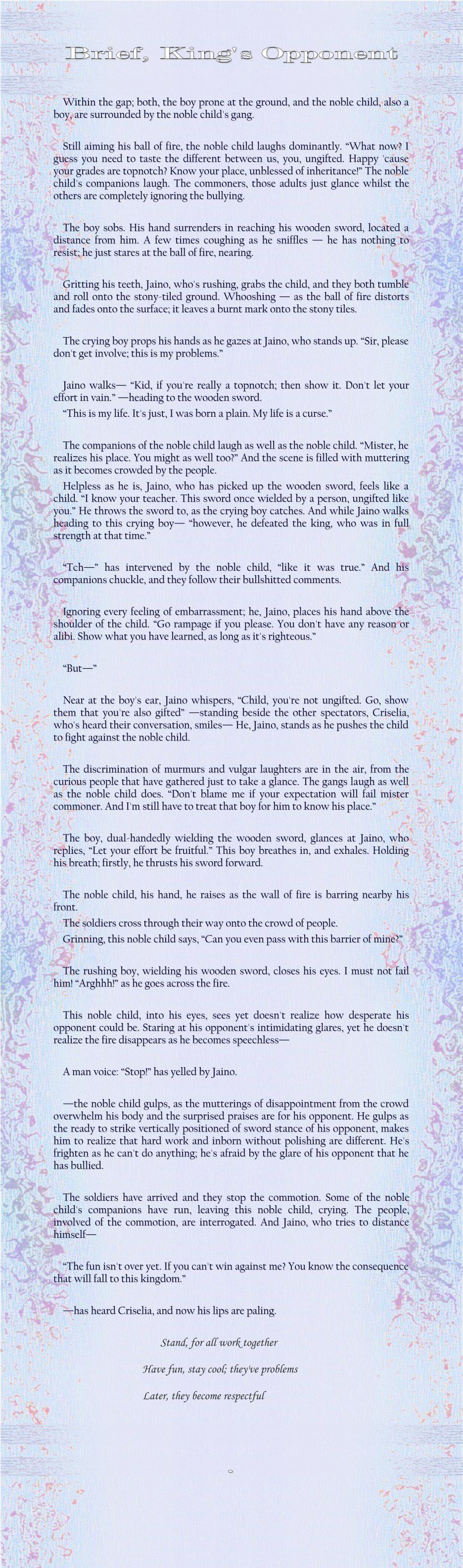 —the noble child gulps, as the mutterings of disappointment from the crowd overwhelm his body and the surprised praises are for his opponent. He gulps as the ready to strike vertically positioned of sword stance of his opponent, makes him to realize that hard work and inborn without polishing are different. He's frighten as he can't do anything; he's afraid by the glare of his opponent that he has bullied.