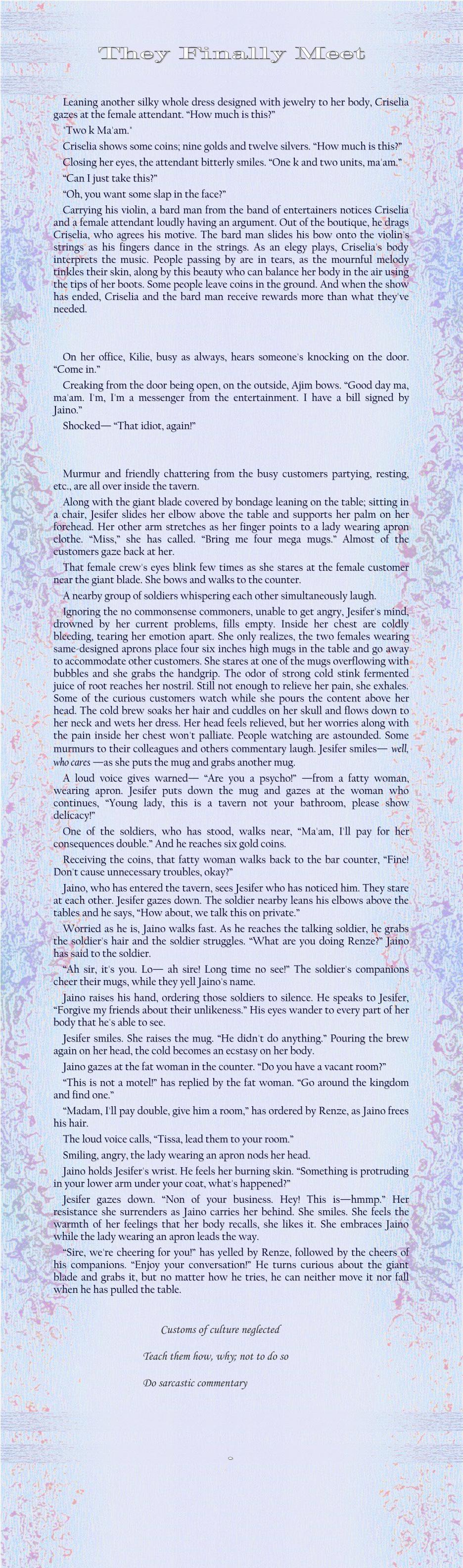 Jesifer gazes down. “Non of your business. Hey! This is—hmmp.” Her resistance she surrenders as Jaino carries her behind. She smiles. She feels the warmth of her feelings that her body recalls, she likes it. She embraces Jaino while the lady wearing an apron leads the way.