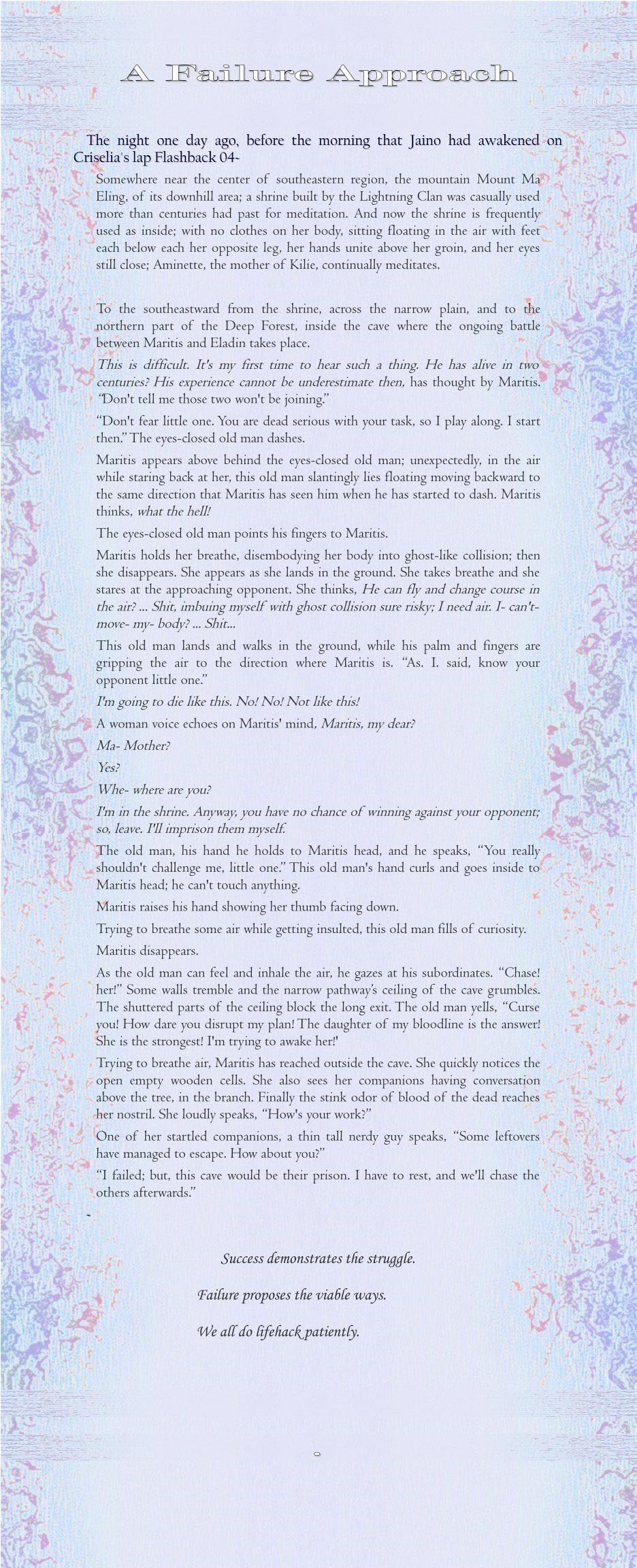 Somewhere near the center of southeastern region, the mountain Mount Ma Eling, of its downhill area; a shrine built by the Lightning Clan was casually used more than centuries had past for meditation. And now the shrine is frequently used as inside; with no clothes on her body, sitting floating in the air with feet each below each her opposite leg, her hands unite above her groin, and her eyes still close; Aminette, the mother of Kilie, continually meditates.
