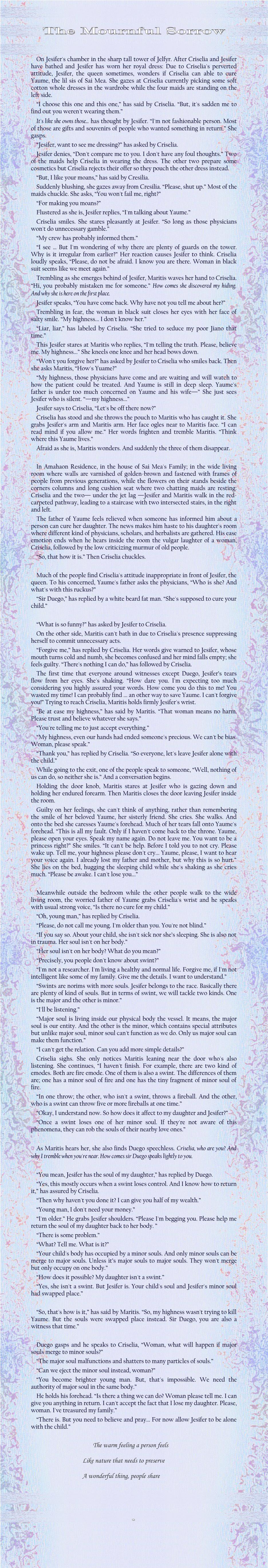 “Forgive me,” has replied by Criselia. Her words give warned to Jesifer, whose mouth turns cold and numb, she becomes confused and her mind falls empty; she feels guilty. “There's nothing I can do,” has followed by Criselia.