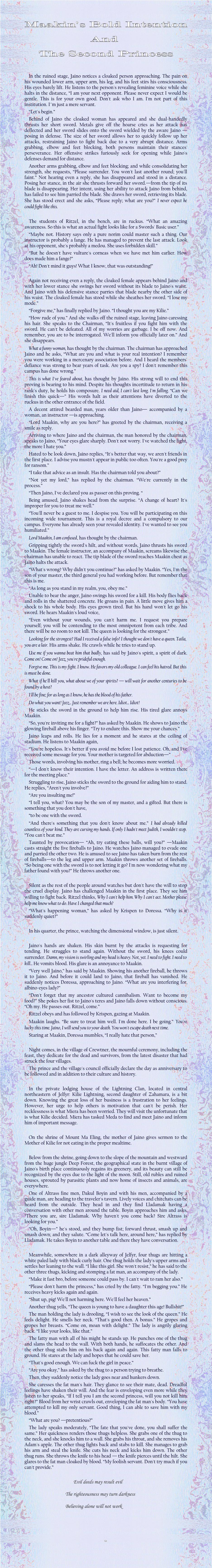 “How rude of you.” And she walks off the ruined stage, leaving Jaino caressing his hair. She speaks to the Chairman, “It's fruitless if you fight him with the sword. He can't be defeated. All of my worries are garbage. I be off now. And remember, you are to be interrogated. We'll inform you officially later on.” And she disappears.