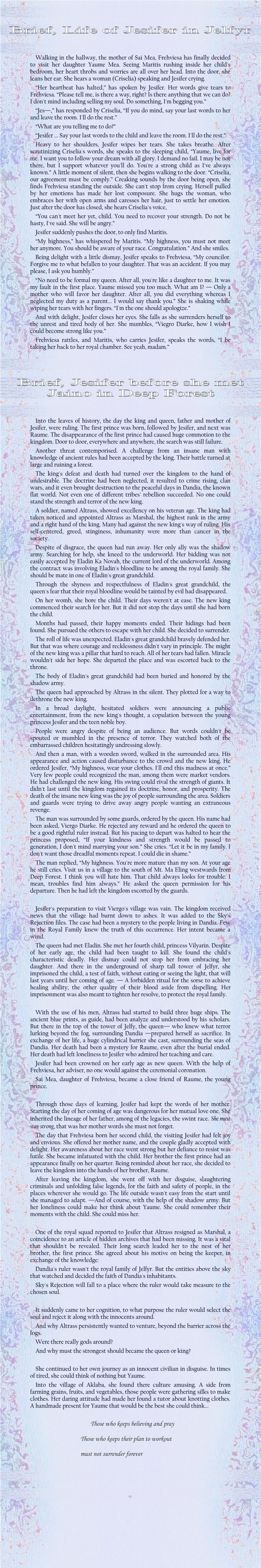 The day that Frehviesa born her second child, the visiting Jesifer had felt joy and envious. She offered her mother name, and the couple gladly accepted with delight. Her awareness about her race went strong but her defiance to resist was futile. She became infatuated with the child. Her brother the first prince had an appearance finally on her quarter. Being reminded about her race, she decided to leave the kingdom into the hands of her brother, Raume.
