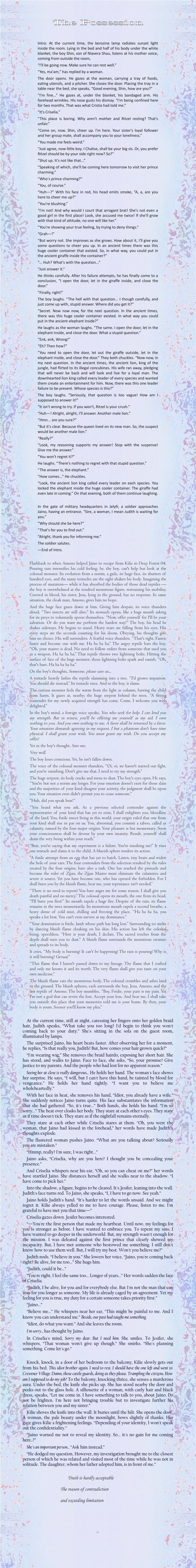 “A futile attempt from an egg that has yet to hatch. Listen, tiny brain and widen the hole of your ears. The four contenders from the selection resulted by the rules created by the four origins, have also a task. One has reached the pinnacle and become the ruler of Zjjan, the Zjjan Master must eliminate the calamities and severe it source. Yet you have become one, who has opened the forbidden. For I shall burn you by the bluish flame, hear me, your repentance isn't needed.”
