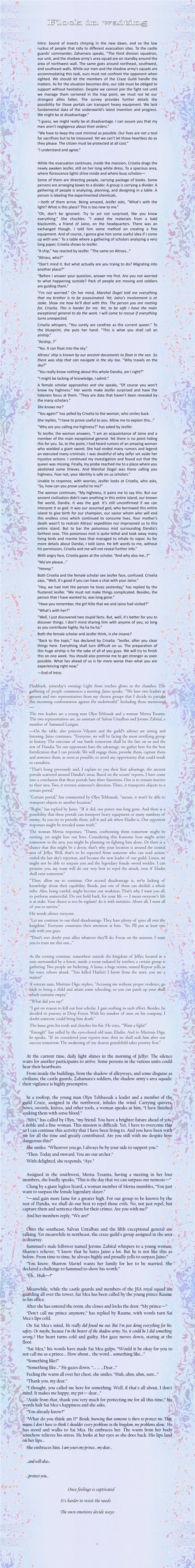 —On the table, also princess Vilyarin and the guild's adviser are sitting and listening. Jaino continues, “Everyone, we will be facing the most terrifying group in history. The outcome of our battle tomorrow shall be the fate on us and the rest of Dandia. Yet our opponents have the advantage, we gather here for the best fortification that I can provide. We will engage them, provoke them, capture them and sentence them, as soon as possible, to avoid any opportunity that could result to casualties.