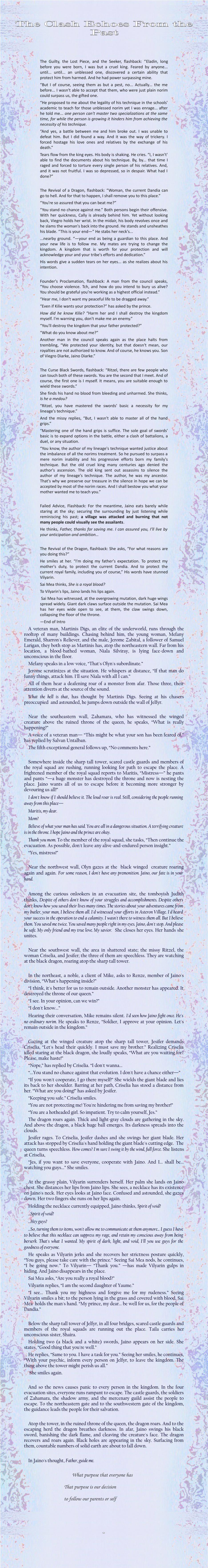 “You stand no chance against me.” Both persons begin their offensive. With her quickness, Cally is already behind him. Yet without looking back, Viegro holds her wrist. In the midair, his body revolves once and he slams the woman's back into the ground. He stands and unsheathes his blade. “This is your end—” He stabs her neck's...