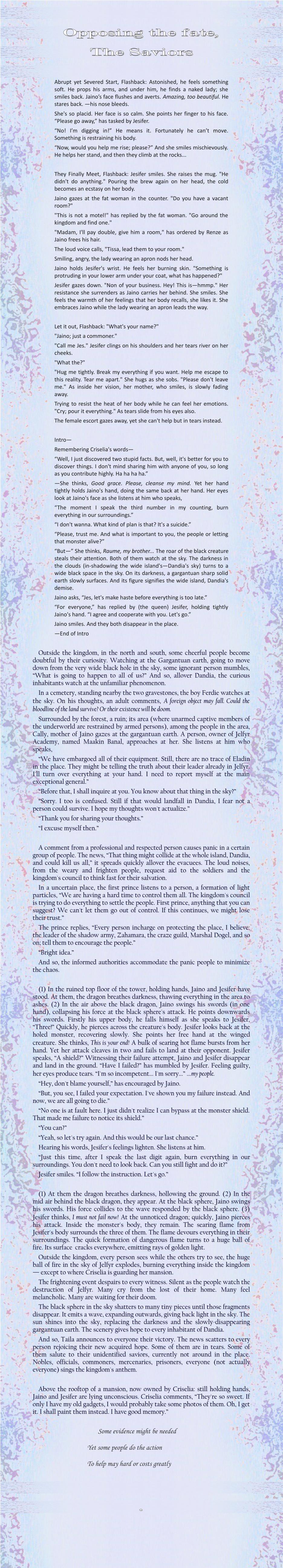 (1) In the ruined top floor of the tower, holding hands, Jaino and Jesifer have stood. At them, the dragon breathes darkness, thawing everything in the area to ashes. (2) In the air above the black dragon, Jaino swings his swords (in one hand), collapsing his force at the black sphere's attack. He points downwards his swords. Firstly his upper body, he falls himself as she speaks to Jesifer, “Three!” Quickly, he pierces across the creature's body. Jesifer looks back at the holed monster, recovering slowly. She points her free hand at the winged creature. She thinks, This is your end! A bulk of searing hot flame bursts from her hand. Yet her attack cleaves in two and fails to land at their opponent. Jesifer speaks, “A shield?” Witnessing their failure attempt, Jaino and Jesifer disappear and land in the ground. “Have I failed?” has mumbled by Jesifer. Feeling guilty, her eyes produce tears. “I'm so incompetent... I'm sorry...” ...my people.
