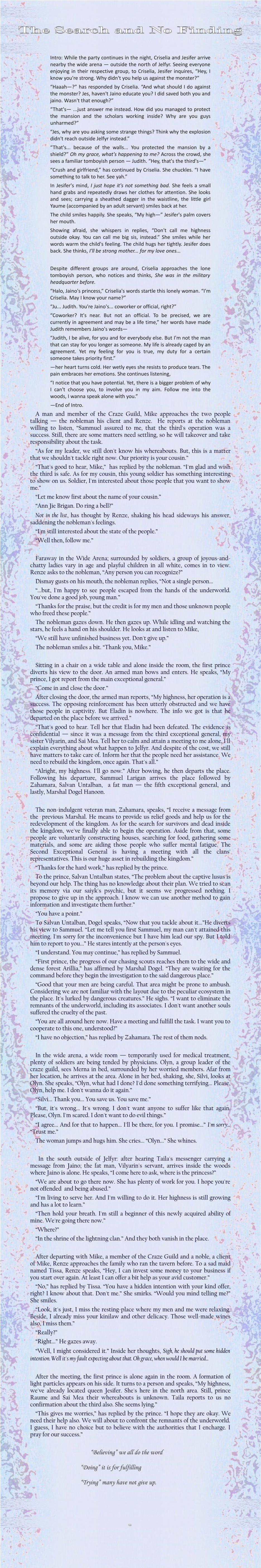 In the south outside of Jelfyr: after hearing Taila's messenger carrying a message from Jaino; the fat man, Vilyarin's servant, arrives inside the woods where Jaino is alone. He speaks, “I come here to ask, where is the princess?”