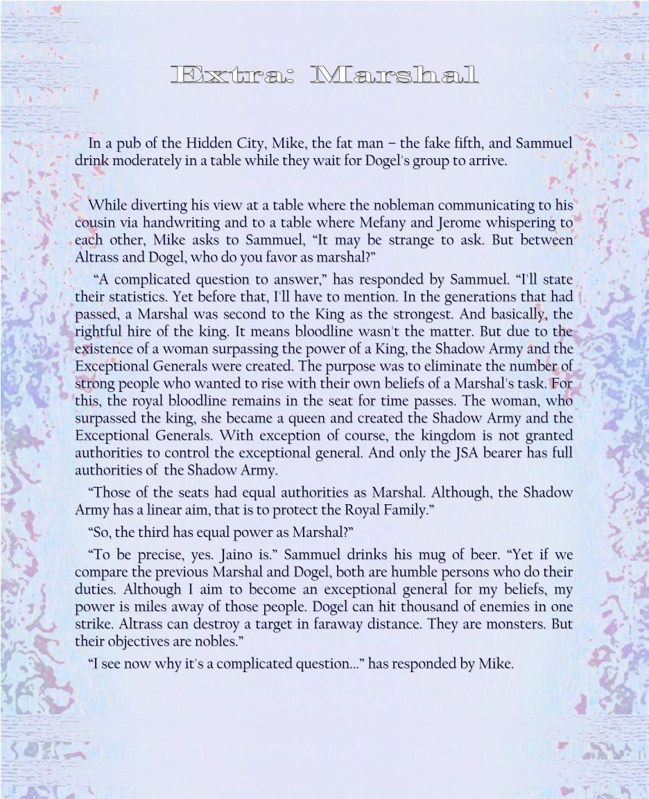 “A complicated question to answer,” has responded by Sammuel. “I'll state their statistics. Yet before that, I'll have to mention. In the generations that had passed, a Marshal was second to the King as the strongest. And basically, the rightful hire of the king. It means bloodline wasn't the matter. But due to the existence of a woman surpassing the power of a King, the Shadow Army and the Exceptional Generals were created. The purpose was to eliminate the number of strong people who wanted to rise with their own beliefs of a Marshal's task. For this, the royal bloodline remains in the seat for time passes. The woman, who surpassed the king, she became a queen and created the Shadow Army and the Exceptional Generals. With exception of course, the kingdom is not granted authorities to control the exceptional general. And only the JSA bearer has full authorities of the Shadow Army.