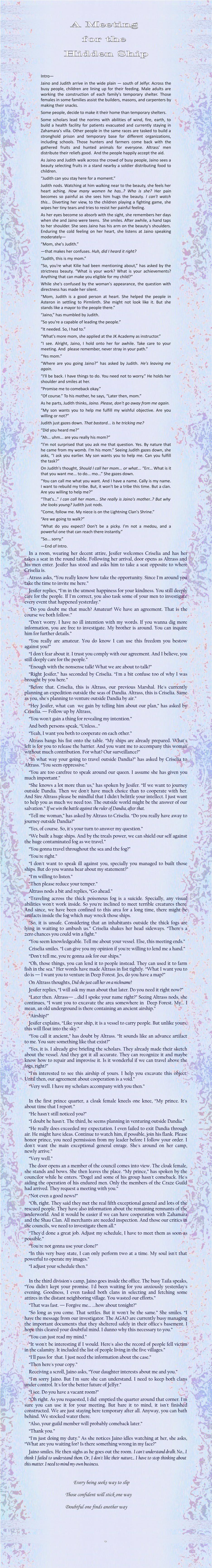 “So long as you come. That settles. But it won't be the same.” She smiles. “I have the message from our investigator. The AGAO are currently busy managing the important documents that they sheltered safely in their office's basement. I hope this cleared your doubtful mind. I dunno why this necessary to you.”