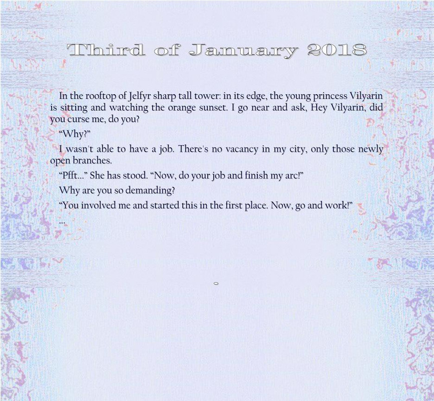 In the rooftop of Jelfyr sharp tall tower: in its edge, the young princess Vilyarin is sitting and watching the orange sunset. I go near and ask, Hey Vilyarin, did you curse me, do you?