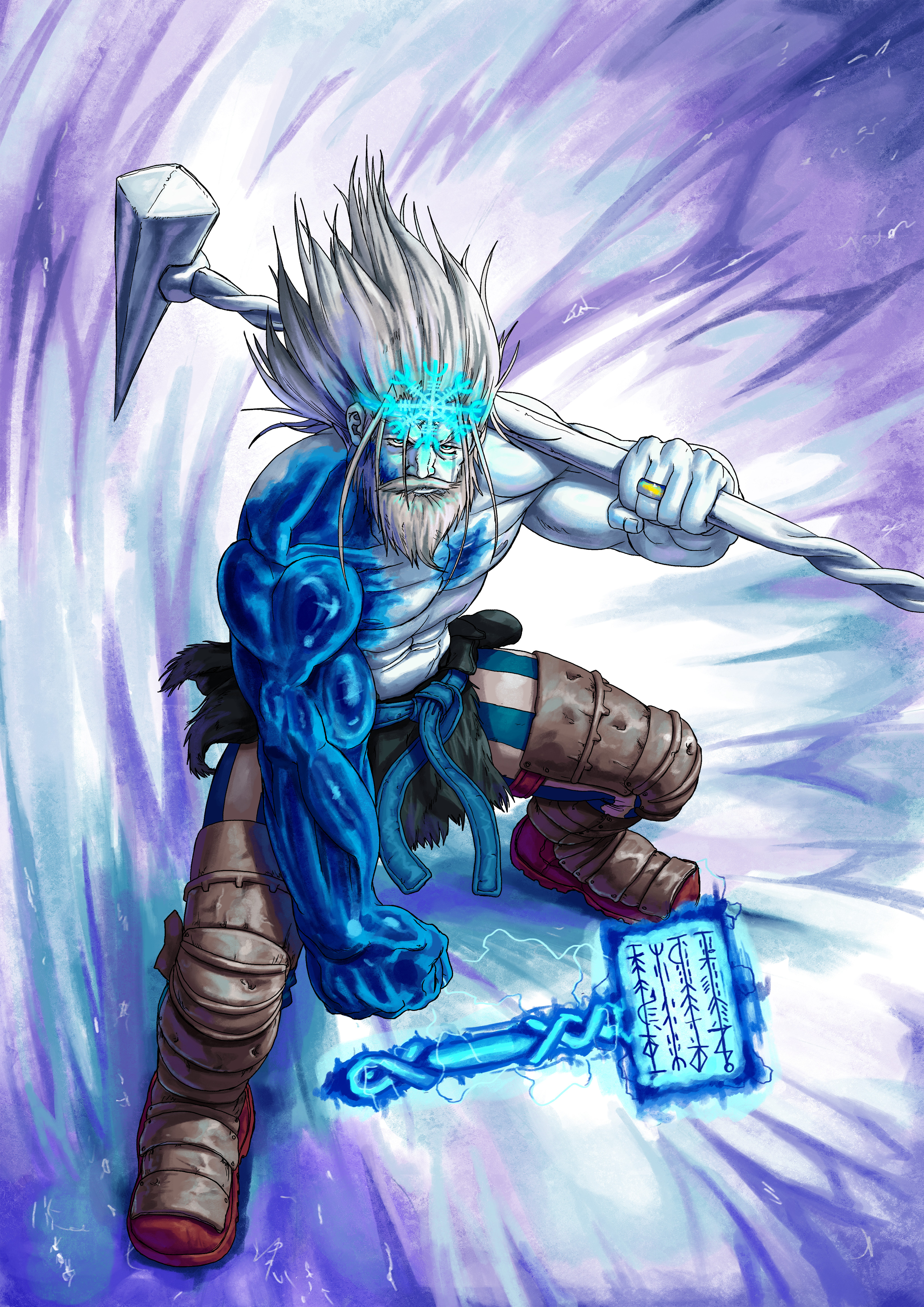 The Borean named Jorfr undid his cloak's clasp and let the whole thing blow away from him. Just his physical presence alone equaled that of ten men, easily surpassing two meters in height and not lacking in bulk in the slightest, despite an apparent absence of much body fat. It seemed as though the Borean's milky-white skin was mere moments from bursting, so tightly wrapped it was around his musculature. His lower half was clad in a loincloth of sorts tied in place by a bright-blue, buckle-less belt, as well as heavy-duty leather boots and trousers made up of lengthwise alternating blue-white stripes. These garments served as the underlayer for dark, full-plate greaves that clad his legs from the thighs down to the boots. On his belt was a hammer of twisted white metal, its chisel-like, diamond-shaped head as long as its handle, and its material reflecting light in iridescent shades.